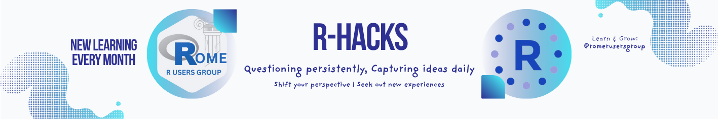 R-Hacks is powered by the Rome R Users Group community. We collect clever ideas, handy functions, and small daily discoveries shared during meetups or projects. The goal is to create a living library of high-impact examples that reflect what people actually use in their analysis—not theoretical snippets, but real solutions to real problems.
