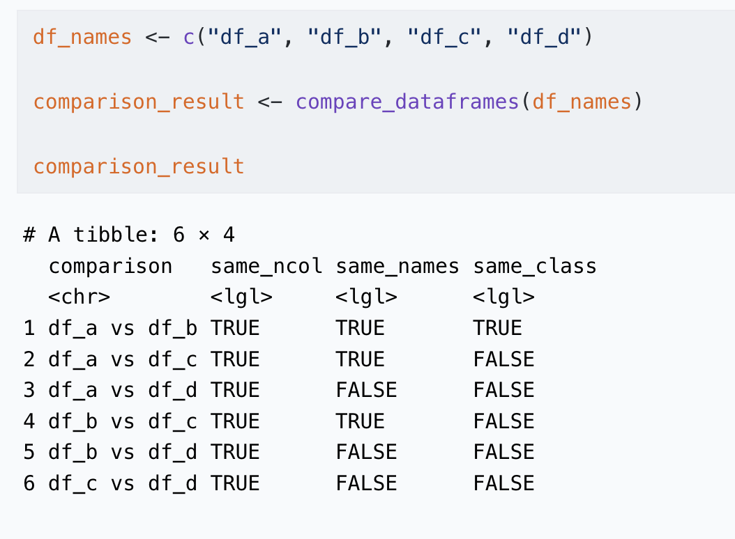# 6 df_c vs df_d TRUE FALSE FALSE Compare multiple dataframes before binding them together